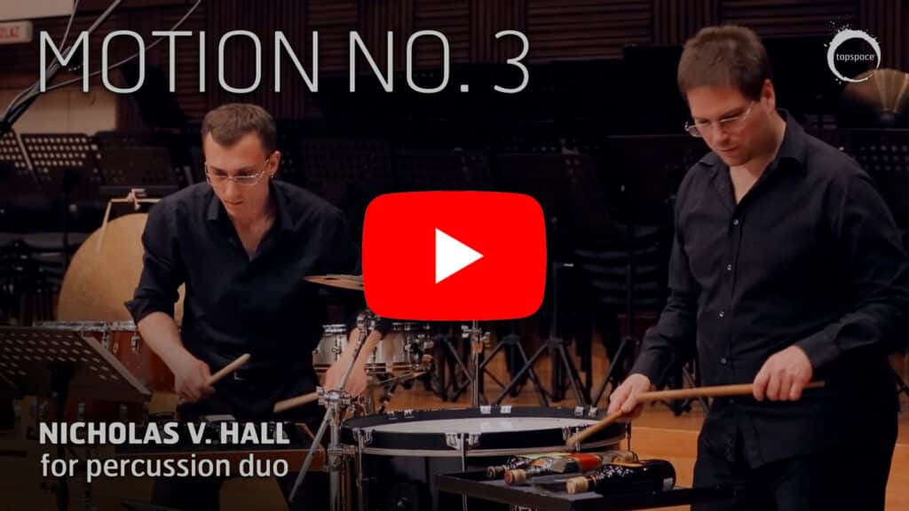 The third work in the Motion series for percussion duo by Nicholas V. Hall. This piece challenges two performers to act as a single voice. Found objects and drumset elements create impressions of life in a busy city.