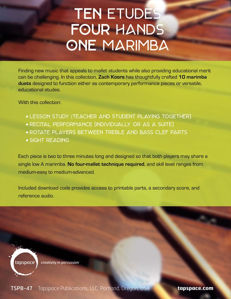 All ten of these etudes fit on a 4.3-octave (low A) marimba, and they are written so they can be played by both players on the same instrument. Each part only requires 2 mallets of each player.
