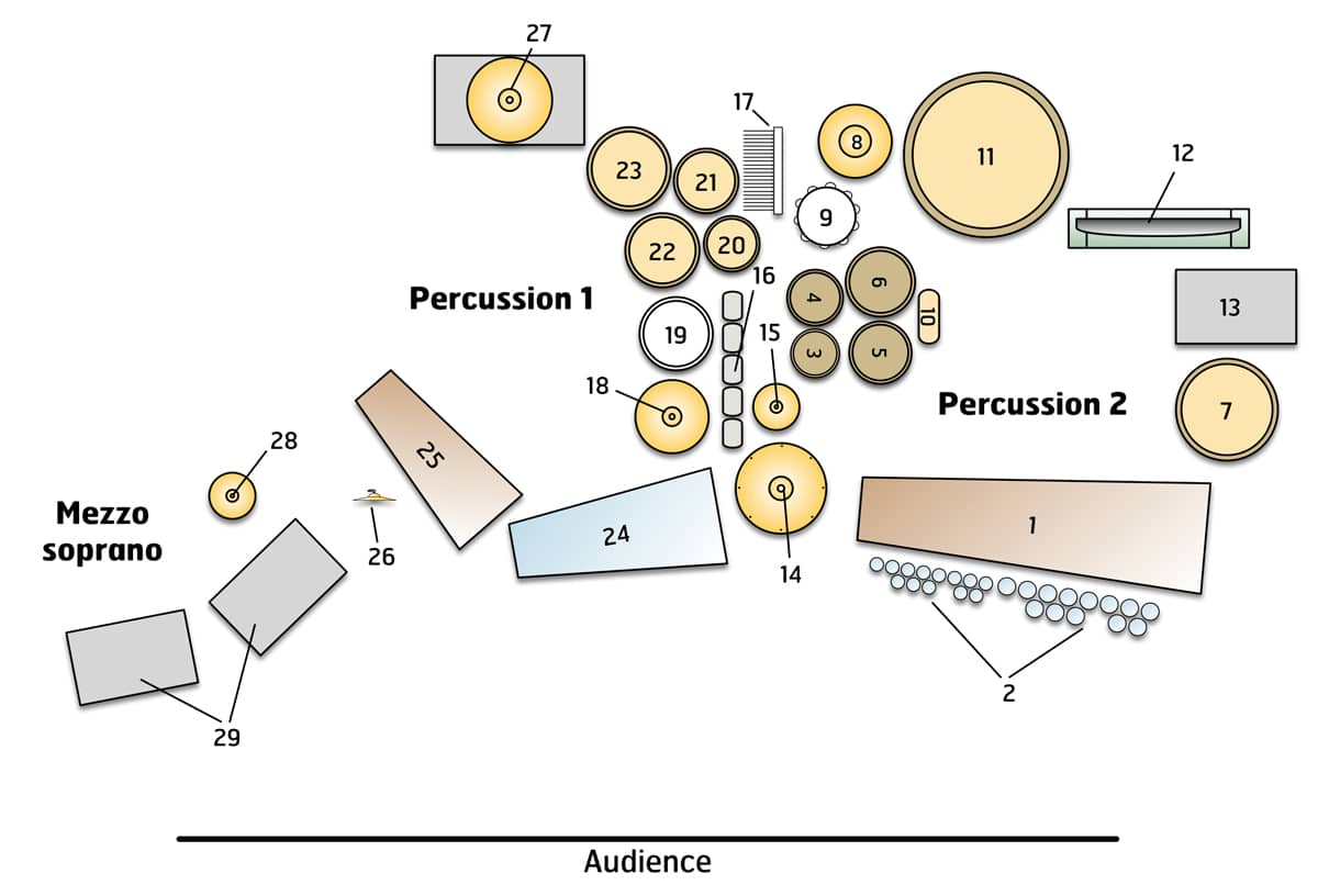 • Accessories (suspended finger cymbals, mark tree, woodblock, tambourine**, 3 or 4 pairs of drumsticks for dropping, ratchet, bike horn, slide whistle, part blower, metal mixing bowl, acme siren, flexatone, vibraslap, train whistle)