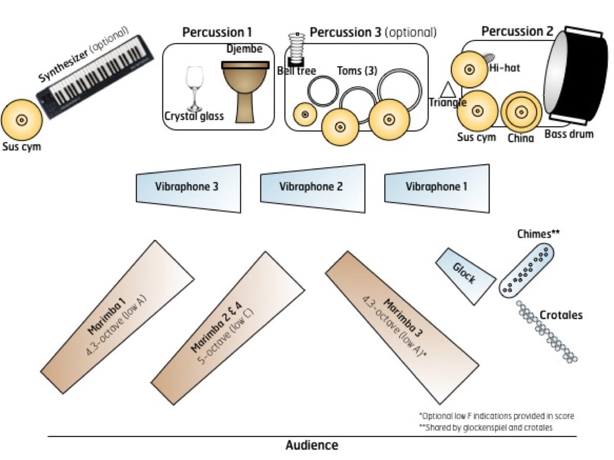 Aether calls for three vibraphones and three or four marimbas, in addition to a few specialized percussion instruments like crotales and djembe, which may not be available to every ensemble. While the piece makes an effort to be accessible to variable sizes of ensembles, it requires a fairly well-stocked instrument inventory.