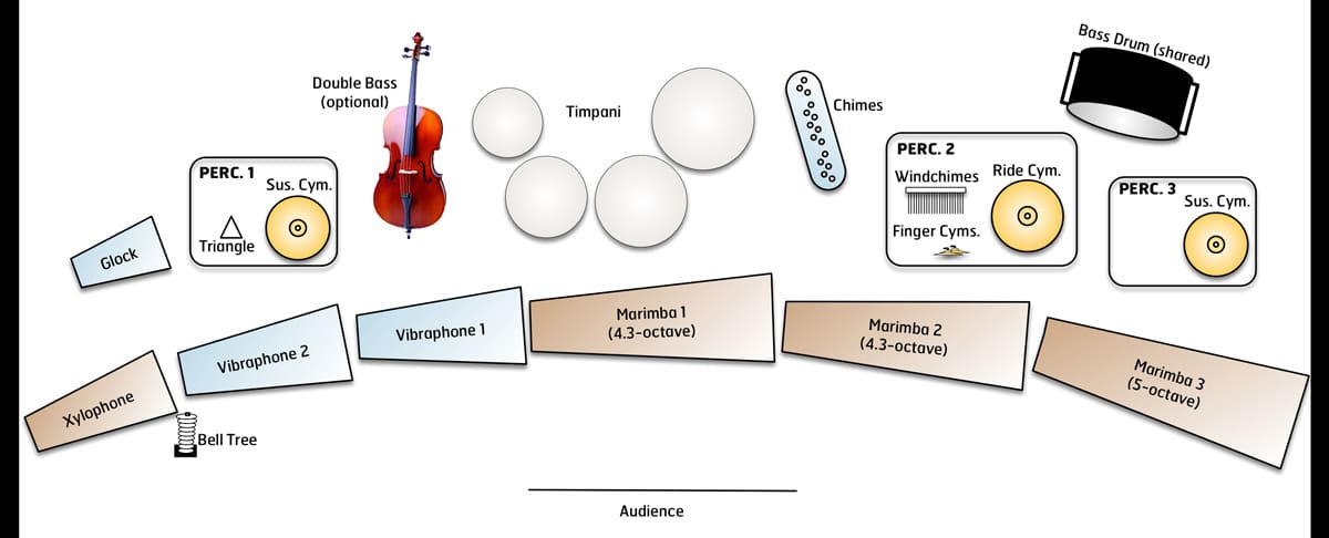 Although many students may not be familiar with the title, most will be familiar with the famous tune in “Anitra’s Dance” of Edvard Grieg’s Peer Gynt Suite No. 1. Originally set as a spritely mazurka for string orchestra with triangle, Brian Blume has adapted the work for a large ensemble of keyboard percussion, timpani, accessories, and optional double bass.
