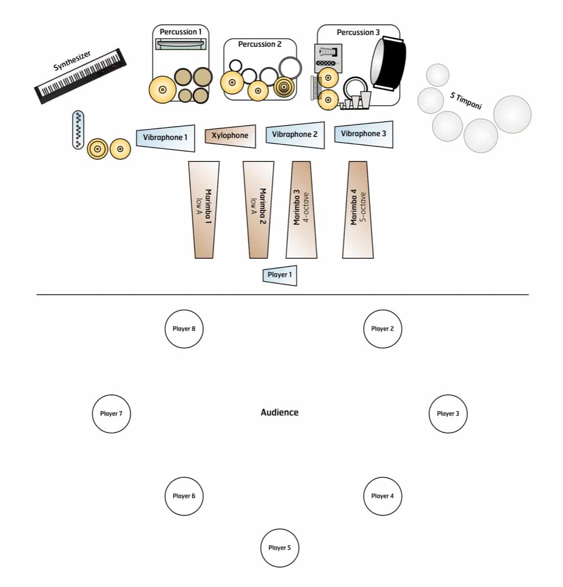 - 4 marimbas — (1) 4-octave, (2) low A, (1) 5-octave