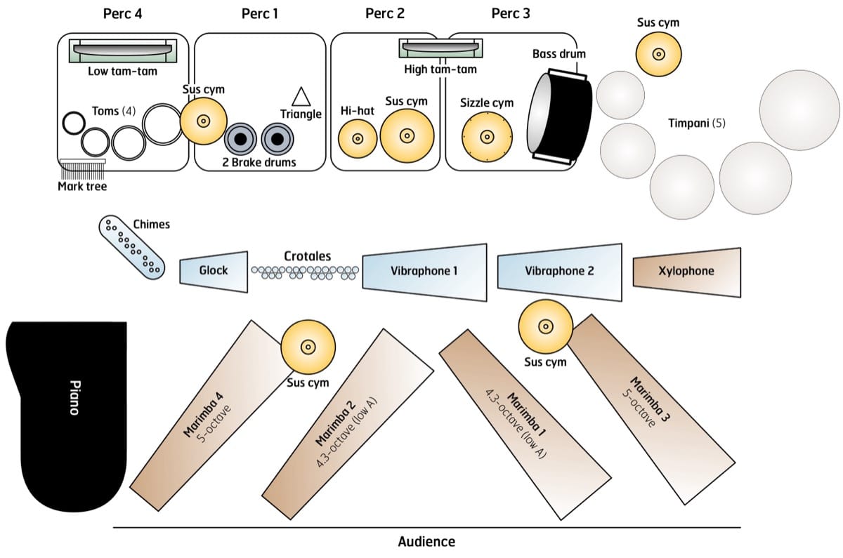 • Cymbals and gongs — hi-hat, 5-6 suspended cymbals, sizzle cymbal, 2 tam-tams (high and low)