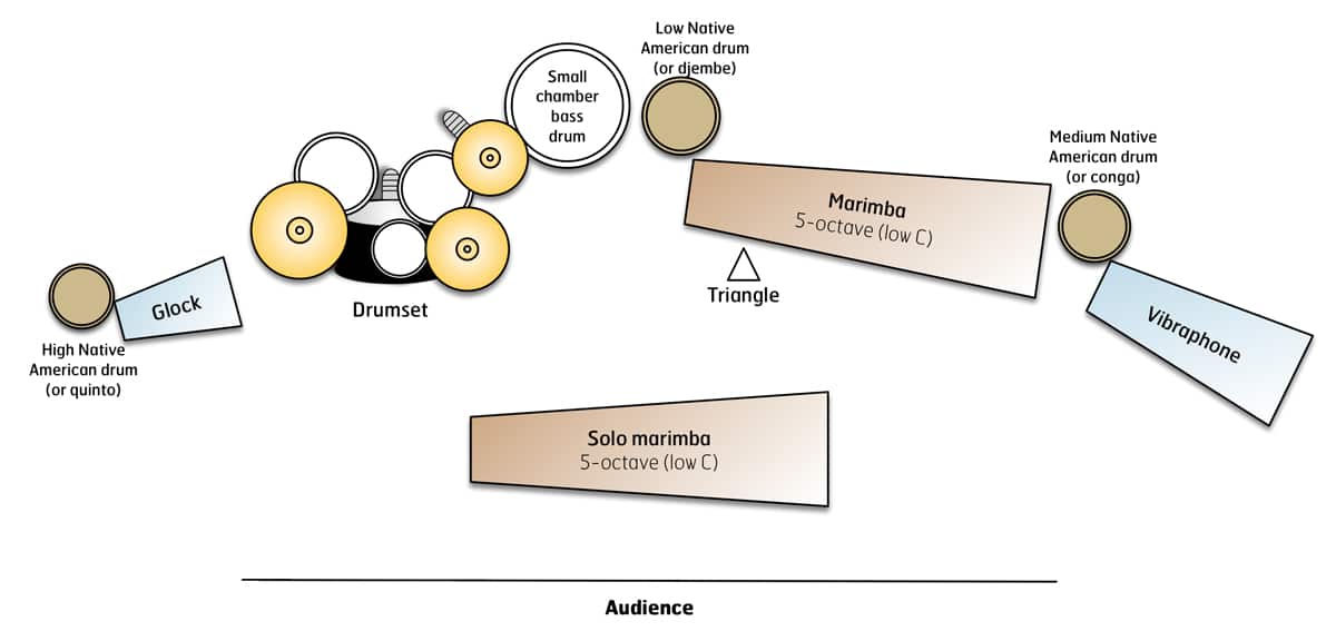 The marimba part is frequently pattern-based and lies nicely on the instrument. At times, it is virtuosic enough for an advanced player. Each of the accompanying quartet parts incorporates a membraphonic timbre in addition to its primary instrument; the drumset player utilizes a small chamber bass drum, and the keyboard players each have a Native American drum (the composer suggests that congas or djembes can be used if Native American drums are unavailable). One prominent compositional component of the piece is the use of mixed meters and compound time signatures. The drumset player will need to have plenty of experience with mixed time signatures to bring success to a performance of this work.