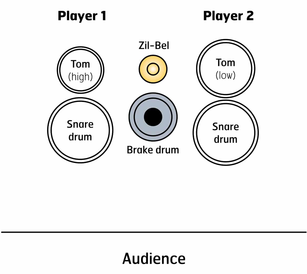 - Drums — 2 concert snare drums, 2 concert toms (high/low)