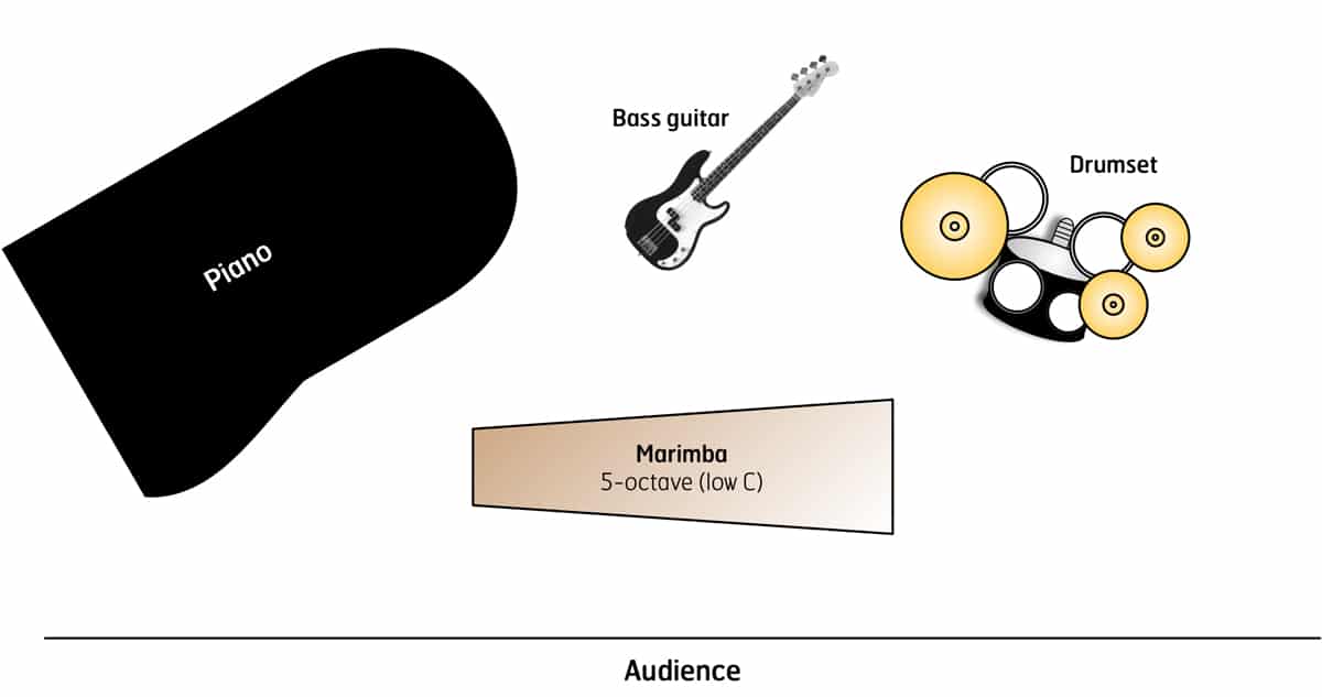 Dedication by Brian Mueller is a an advanced chamber ensemble piece for marimba and a supporting piano trio. In true jazz form, the piece features improvisation in all parts, marimba, piano, bass guitar, and drumset. For the marimba and piano specifically, transcriptions of Mueller’s own tasteful improvisations are included to be used as references for those less experienced with improv. Dedication is filled with energy, excitement, and fun, with a hint of tenderness and will please audiences and challenge performers!