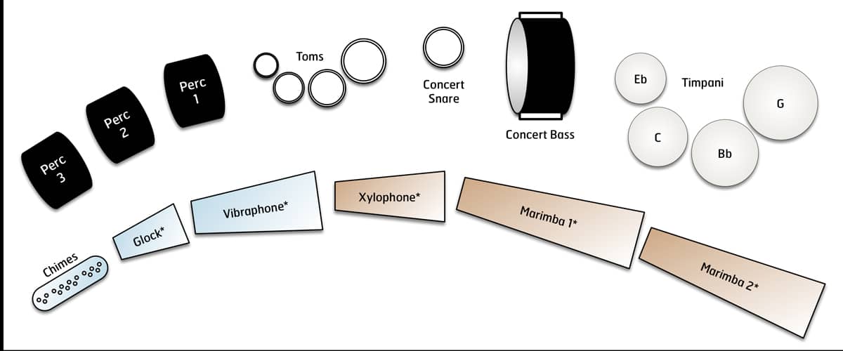- Drums (snare drum, 4 concert toms, concert bass drum)