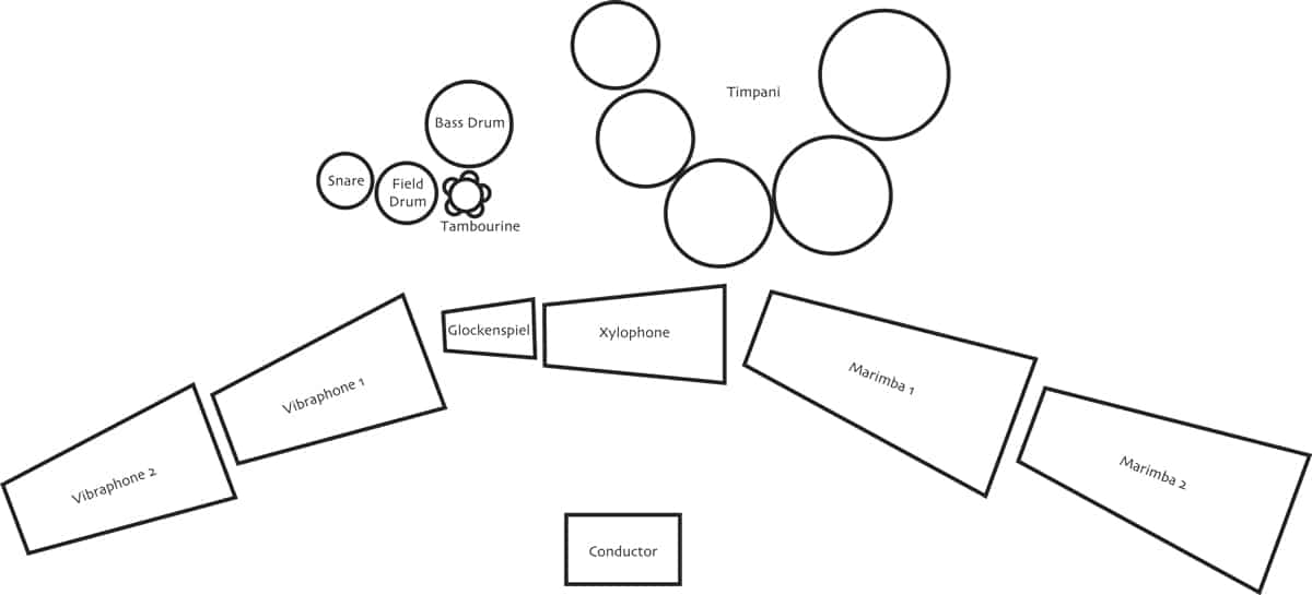Four mallets are needed for the marimbas, two mallets for all the other mallet-keyboard instruments. Since the timpani part is capturing the string bass part from the original, there are man pedal changes. All parts are challenging at the suggested tempo of quarter note = 144. Unison lines and double stops have to be executed with technical precision, and hard mallets on all instruments are required. This is an excellent arrangement. The instruction page is clear and helpful.