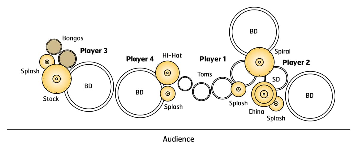 - Cymbals (4 splash cymbals, hi-hat, spiral cymbal, riveted China cymbal, cymbal stack)