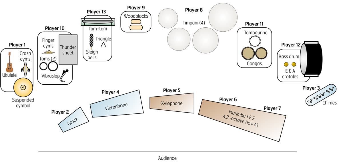 - Cymbals & gongs (suspended cymbal (2), crash cymbals, gong, finger cymbals, tam-tam)