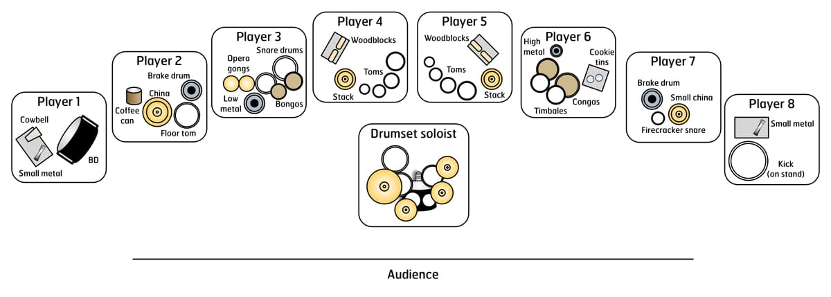Using a creative array of mostly drums and metal instruments (often found objects), the piece features a drumset soloist backed by eight multipercussionists. Throughout the work, various “echo” motifs are used as a defining element while producing varying degrees of polyrhythmic tension and conversational activity between the drumset soloist and the eight percussionists.