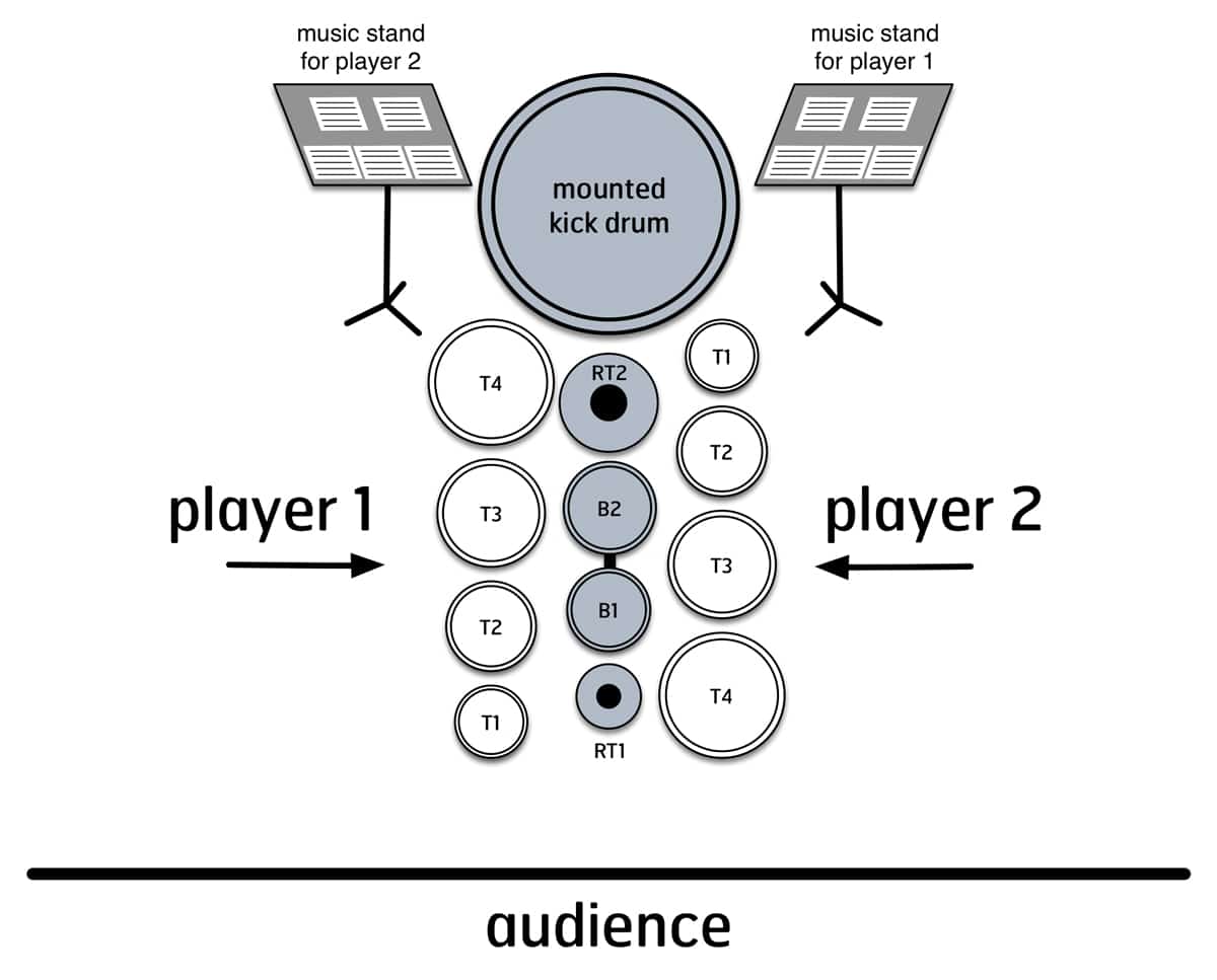 Eight on 3 and Nine on 2 is a multipercussion duet like no other. Written for eight pitched tom toms, 2 rototoms, 2 bongos, and a bass drum, this piece tests percussionists’ abilities to split rhythms. Two players perform the piece facing each other, sharing instruments just as they share in playing almost every rhythm in the piece. The listener is engaged aurally and visually as both performers sound like one in an exciting and captivating percussive showcase.