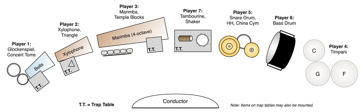 The instructions and notation are very clear and will benefit all performers involved. These include moving to the edge of the drum while playing snare drum, muffled versus open triangle performance, directions for moving to a new instrument, and more. Requiring six to seven players, this composition will fit nicely on a junior high school percussion ensemble program.