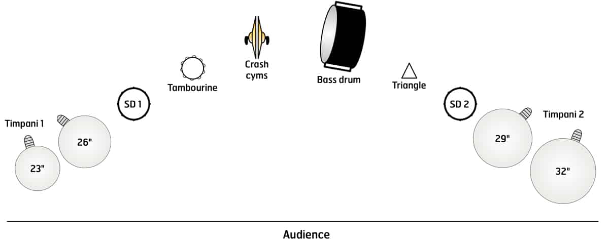 Matt Altmire’s exciting and fast-paced percussion ensemble piece Escape Route features two timpanists who are supported by six percussionists. The timpanists share a full set of four drums, with the first timpanist (stage left) playing the 23” and 26” drums, and second (stage right) playing the 29” and 32” drums. With the drums orchestrated this way, the players often split parts and, if executed well, are able to sound like one cohesive timpanist.