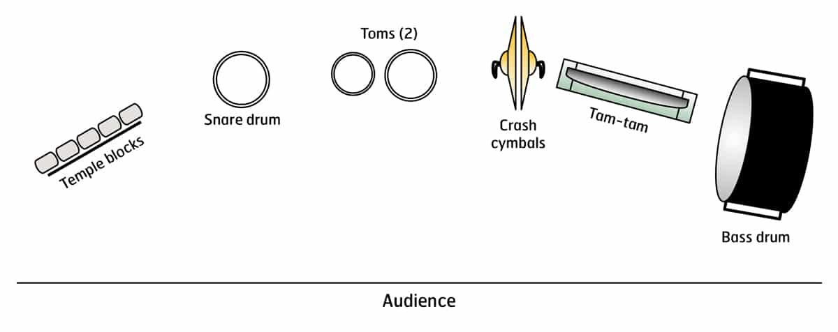 - Drums (snare drum, 2 tom-toms, bass drum)