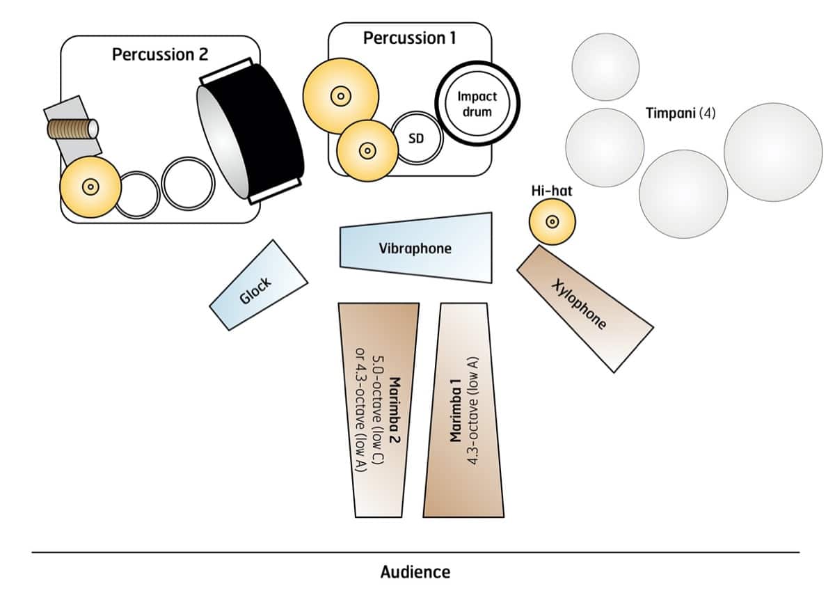 - 2 marimbas—(1) low A, (1) 5-octave (optional: (2) low A)