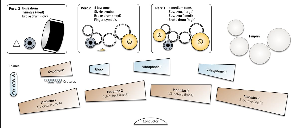 The piece begins with gentle marimba rolls and soft drumming fragments. It builds to a sixteenth-note based flowing section and slowly evolves into a drumming interlude. This section, marked “with primal vitality,” builds into a beautiful, floating 9/8. It concludes as it began and uses a polyrhythmic texture to create an icy, wind-like ending.