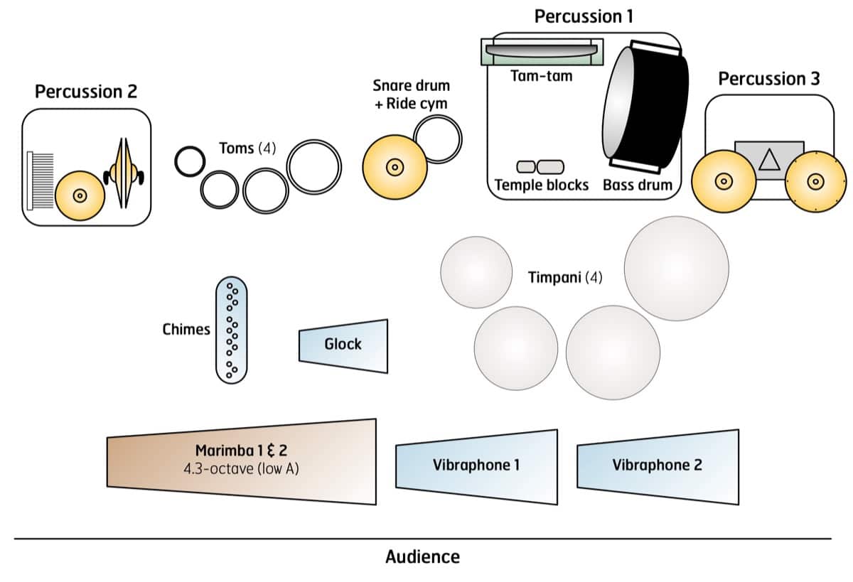 Designed with flexibility in mind, the piece can be performed in a variety of player configurations: as a “non-pitched” quintet, a mallet septet, or full ensemble.