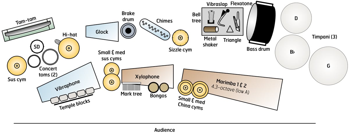 - Accessories (brake drum, mark tree, temple blocks, triangle, flexatone, vibraslap, bell tree, metal shaker)