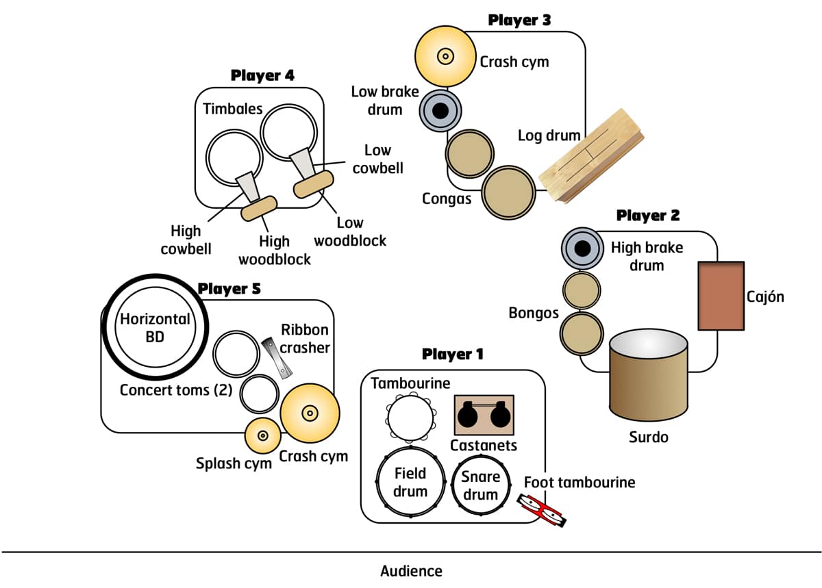• Drums (snare drum, field drum, bongos, surdo (or floor tom), congas, timbales, 2 concert toms, marching bass drum)