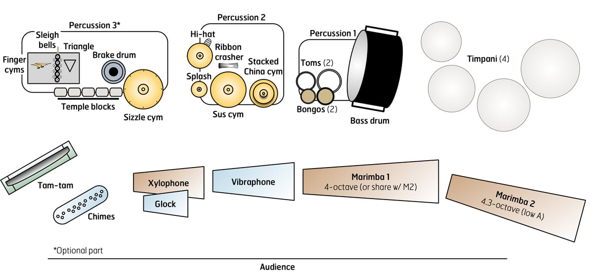 - 1-2 marimbas—4-octave (or share w/ M2), low A (optional low F)