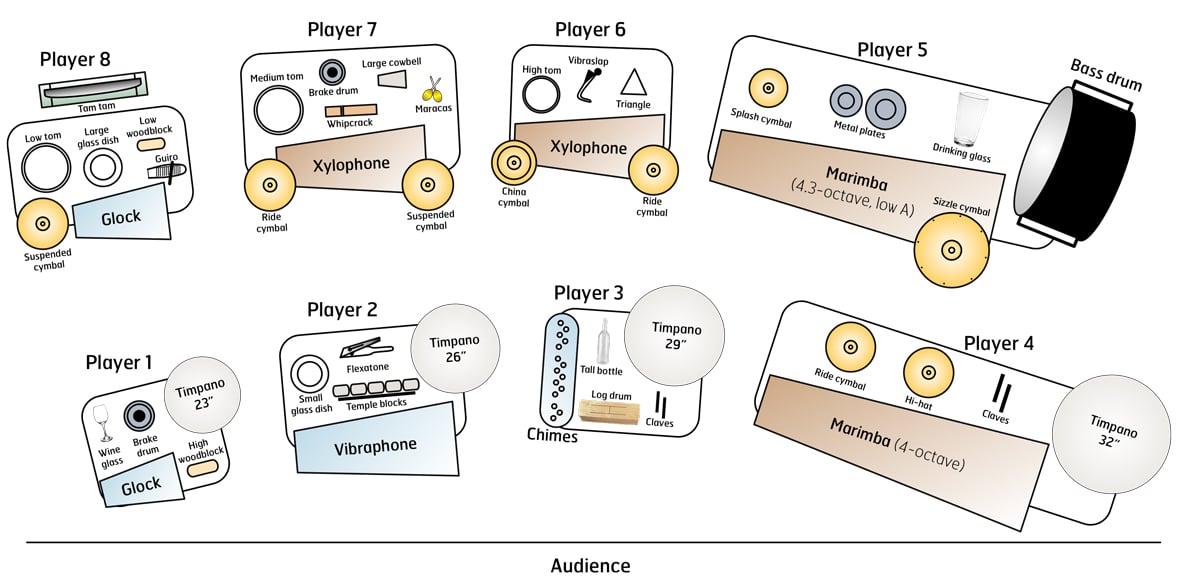 Each performer in this advanced 8-player ensemble has a multipercussion setup comprised of a pitched mallet instrument along with a variety of non-pitched percussion instruments. High Rise is a whirlwind of a piece, guaranteed to engage performers as well as listeners.