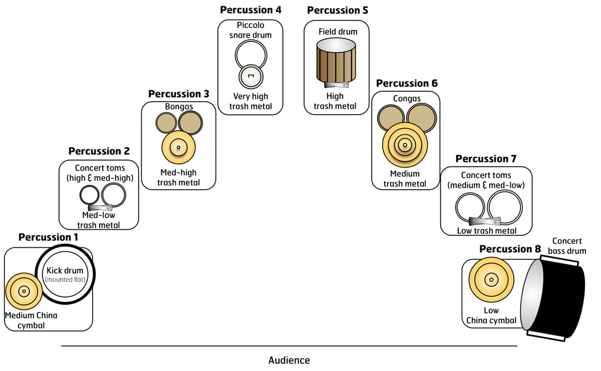 • Drums (bongos, congas (2), 4 concert toms, piccolo snare drum, field drum or deep concert snare, mounted kick drum, concert bass drum)