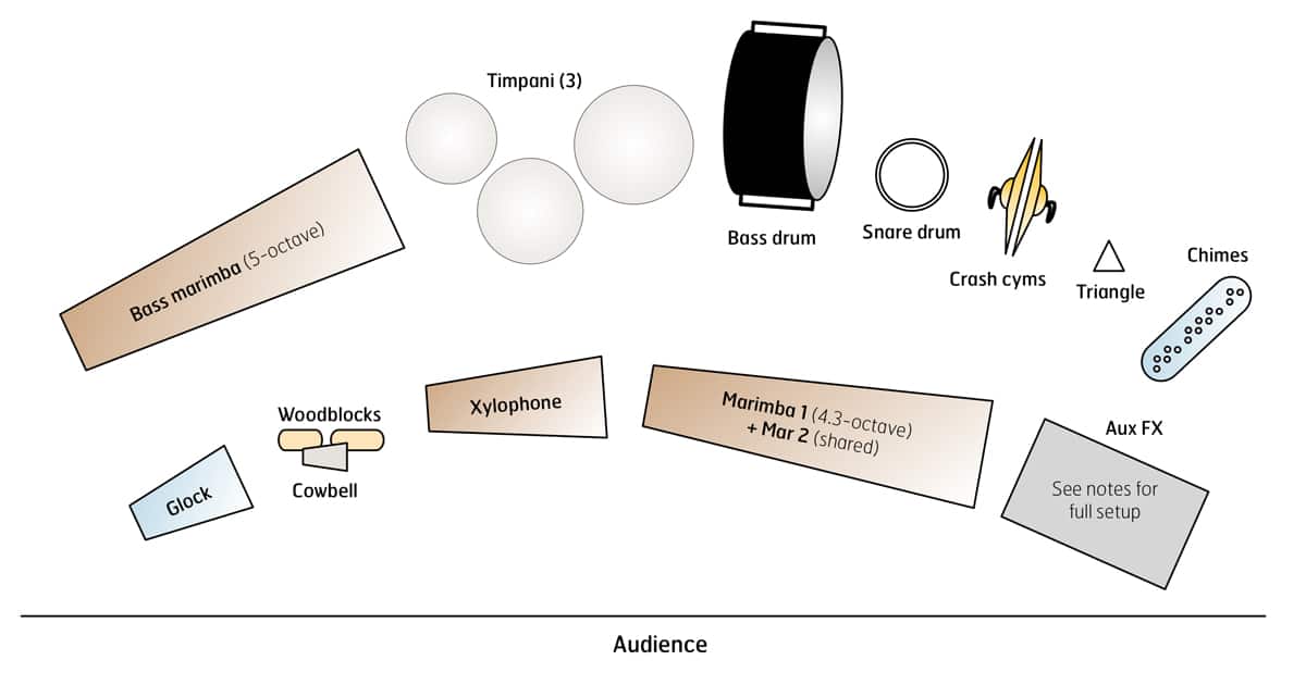 Jokers Wild is as adaptable as it is entertaining. Playable as a trio (xylophone, basic 4-mallet marimba, percussion), it’s also expandable through optional parts that can reach thirteen or more players! Listed in the score is an order of priority for adding extra parts to the trio – a kind of “choose your own adventure” approach to building the ensemble.