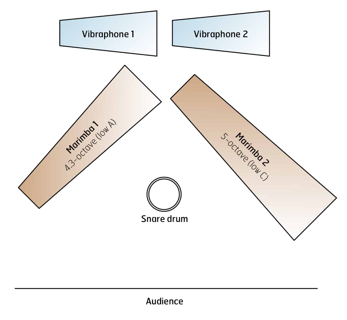 Technically, the challenge of this piece is almost completely on the soloist. The mallet ensemble parts require only two-mallet facility, and rhythmically they show little demand beyond a dotted-eighth rhythm in one bar of the piece. This makes the piece perfect for someone who wishes to solo with a less experienced ensemble.