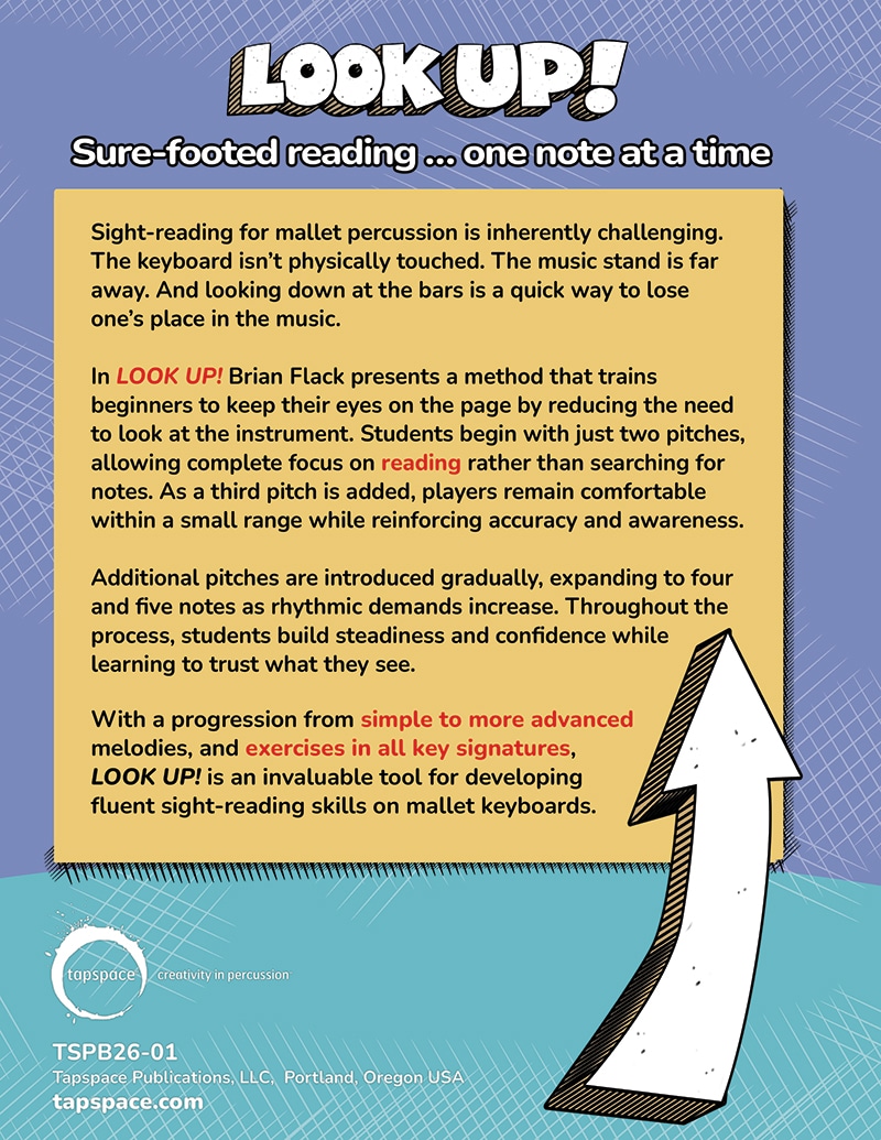 Look Up! by Brian Flack is a sight-reading method book designed to help young mallet players lift their eyes off the bars and stay fully engaged with the music in front of them. Instead of overwhelming students with the full instrument at once, the book takes a refreshingly simple approach: shrink the range, build the skill, then expand with confidence.