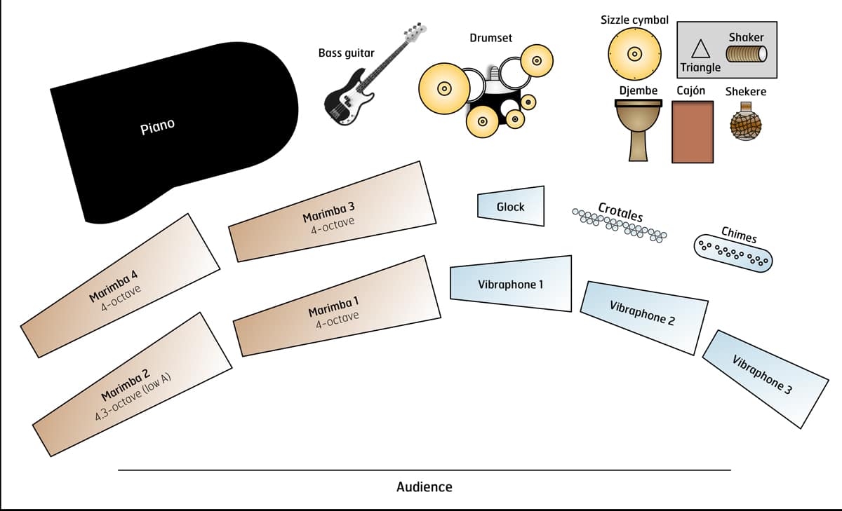- 4 marimbas — (3) 4-octave, (1) low A