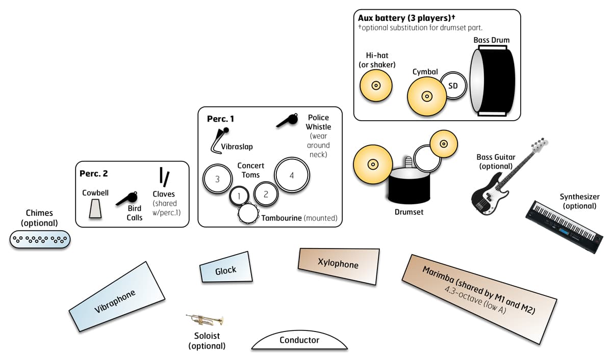 The familiar motivic dialog between two voices is orchestrated between the low marimba and the xylophone and vibraphone in unison. The contrasting interludes are most often voiced in the glockenspiel and vibraphone, setting somewhat of a wood vs. metal juxtaposition. Throughout the piece, the nonpitched percussion, including drumset and a variety of sound effect instruments, are especially creative and add an incredibly entertaining element and solid groove to the arrangement. If a drumset is unavailable or more players are to be incorporated in the performance, an auxiliary percussion part for two players on snare drum, bass drum, and crash cymbals is provided.