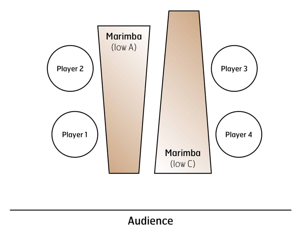 Marimba Quartet No. 2 is a bright, energetic piece by up-and-coming composer/percussionist Christopher Bradford. This work is full of rhythmic and harmonic twists and turns that weave an intricate but beautiful web for four players on two instruments. Two of the players share a 4.3-octave (low A) marimba while the other two share a 5-octave (low C) marimba.