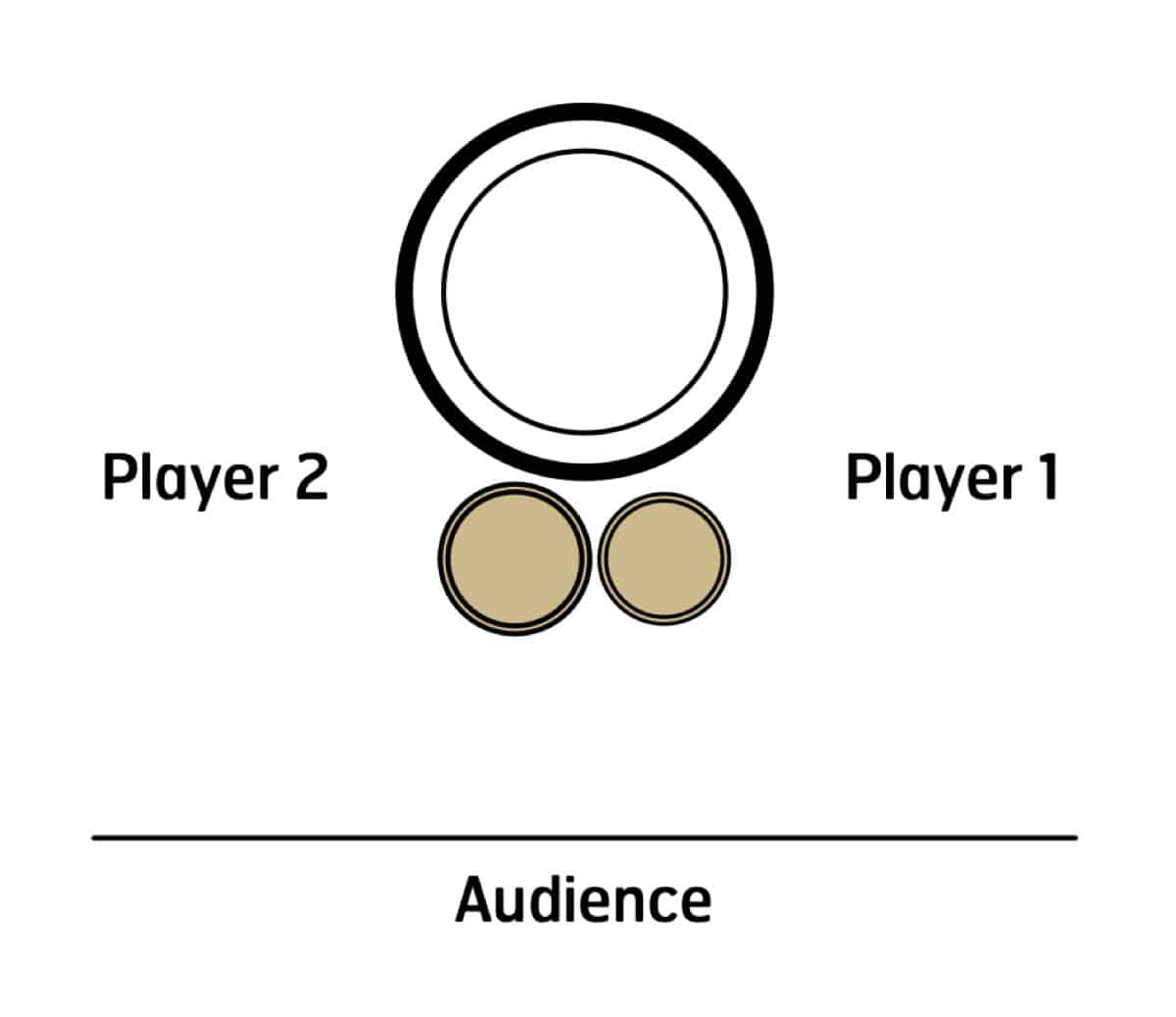 Motion No. 1 by Nicholas V. Hall is a fiery duet for shared bass drum and a set of bongos. Two percussionists act as one, hocketing rhythmic snippets back and forth and splitting 32nd note clusters as the piece alternately boils and simmers. With the bass drum (or kick drum) mounted horizontally and the two performers facing one another on either side, this is sure to be a crowd pleaser and a concert highlight.
