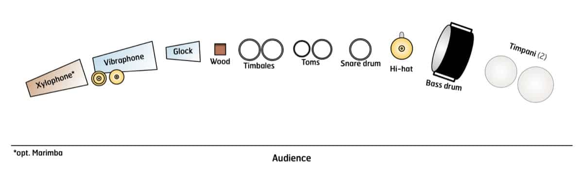 - Cymbals — hi-hat (may substitute any dry, articulate sound), China cymbal, suspended cymbal