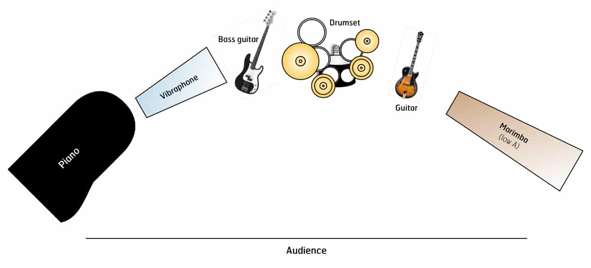 The rhythm section parts are what should be expected form a jazz chart. They include chords and a suggested part, where appropriate, but are clear for improvisation. The marimba part is quite busy throughout the tune but is very chordal in nature. finally, the guitar and vibraphone (or tenor pan) parts provide the head of the tune and bulk of the improvised soloing. The form of the piece is fairly standard and easy to follow.