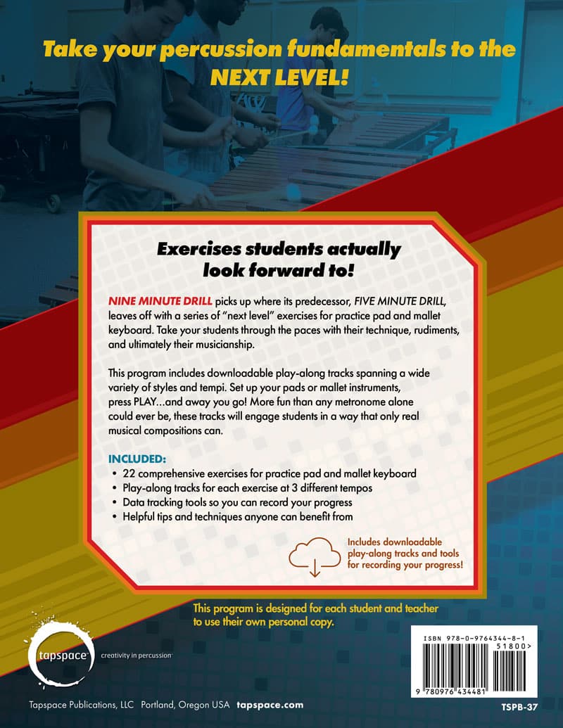 Nine Minute Drill picks up where its predecessor, Five Minute Drill, leaves off with a series of “next level” exercises for practice pad and mallet keyboard. Take  intermediate students through the paces with their technique, rudiments, and ultimately their musicianship. The accompanying CD-ROM contains engaging play-along tracks at a variety of styles and tempos. Set up your pads or mallet instruments, press PLAY…and away you go! More fun than any metronome alone could ever be, these tracks will engage students in a way that only real musical compositions can.