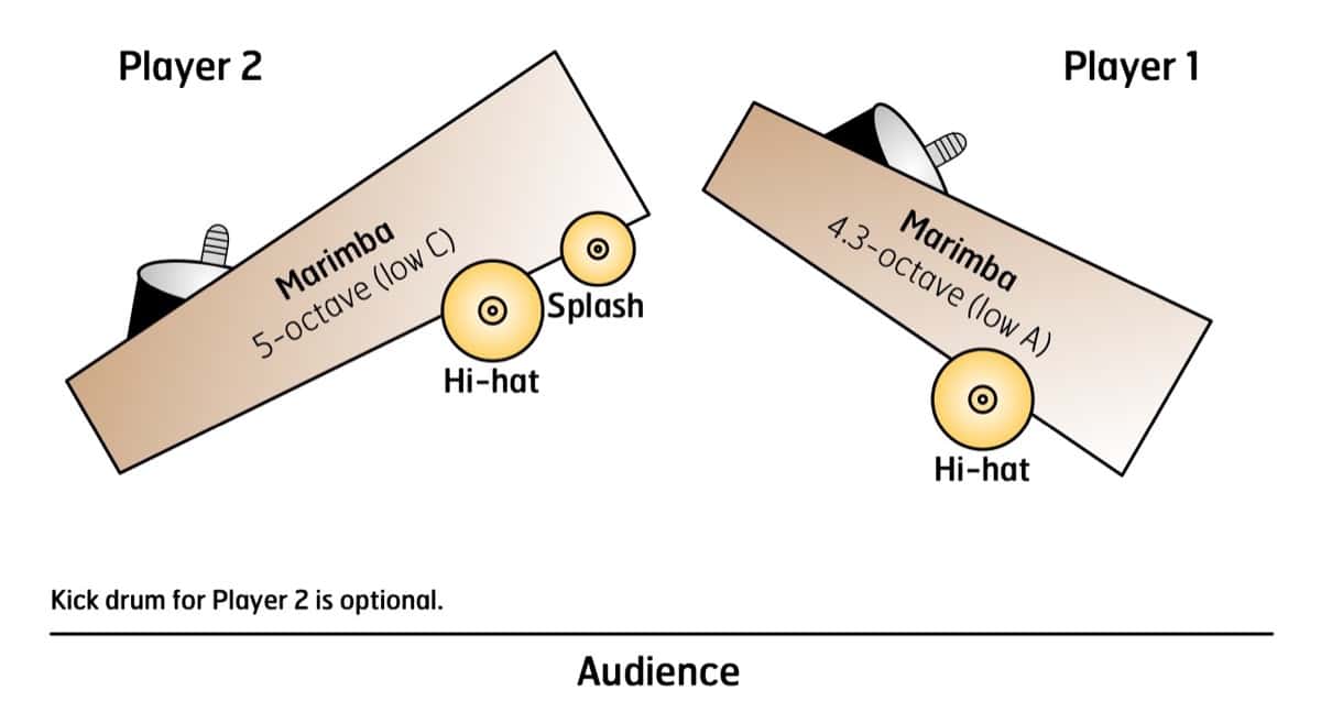 Much of the piece revolves around the interaction between the players, with hocketing being a recurring compositional device throughout. Each person mainly plays on a marimba, with an extended multipercussion setup including kick drum and hi-hats creating a hard-driving groove. The work is specifically inspired by the Hamasyan tune “The Court Jester,” characterized by highly creative chord progressions and impressive metric displacement. Any pair of capable percussionists will enjoy learning this piece for recitals, contests, or just sheer fun!