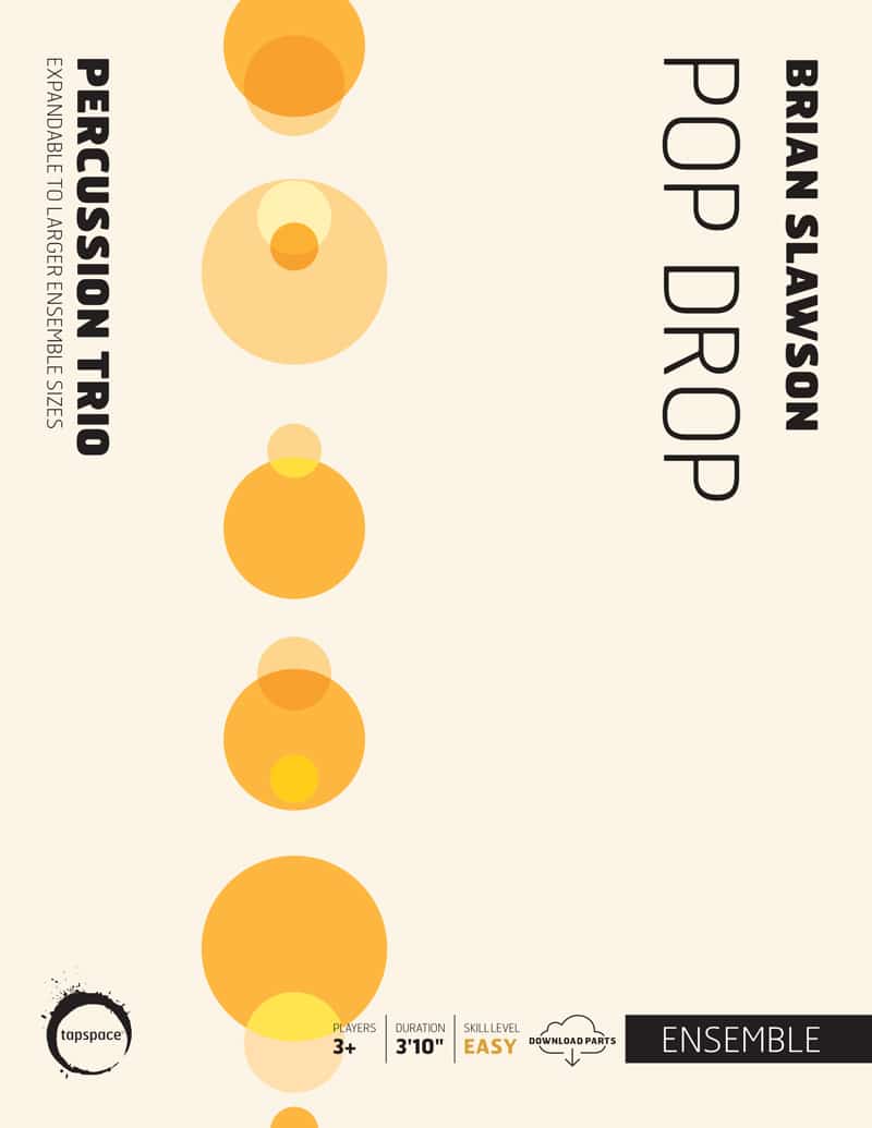 Pop Drop is another work by Brian Slawson aimed at developing the ensemble skills of young performers. Duple rhythms are passed around and played in unison, requiring the ensemble to listen carefully and communicate without a conductor. Each performer may choose their own instrument from a list provided. Additional players may be added to increase the fun, so long as their chosen instrument coincides with the part they are doubling.