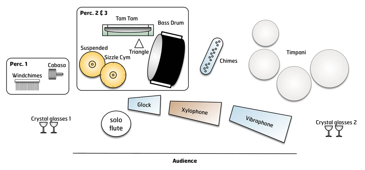 From a logistics standpoint, all the percussion parts can be performed with two mallets, rhythms are rarely complex, and the solo flute line, while covering a wide range of the instrument, can be attained by a confident high school flutist.