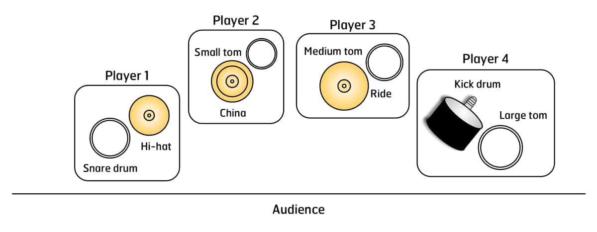 Note: these standard pieces of a 5-piece drumset are divided up among four players.