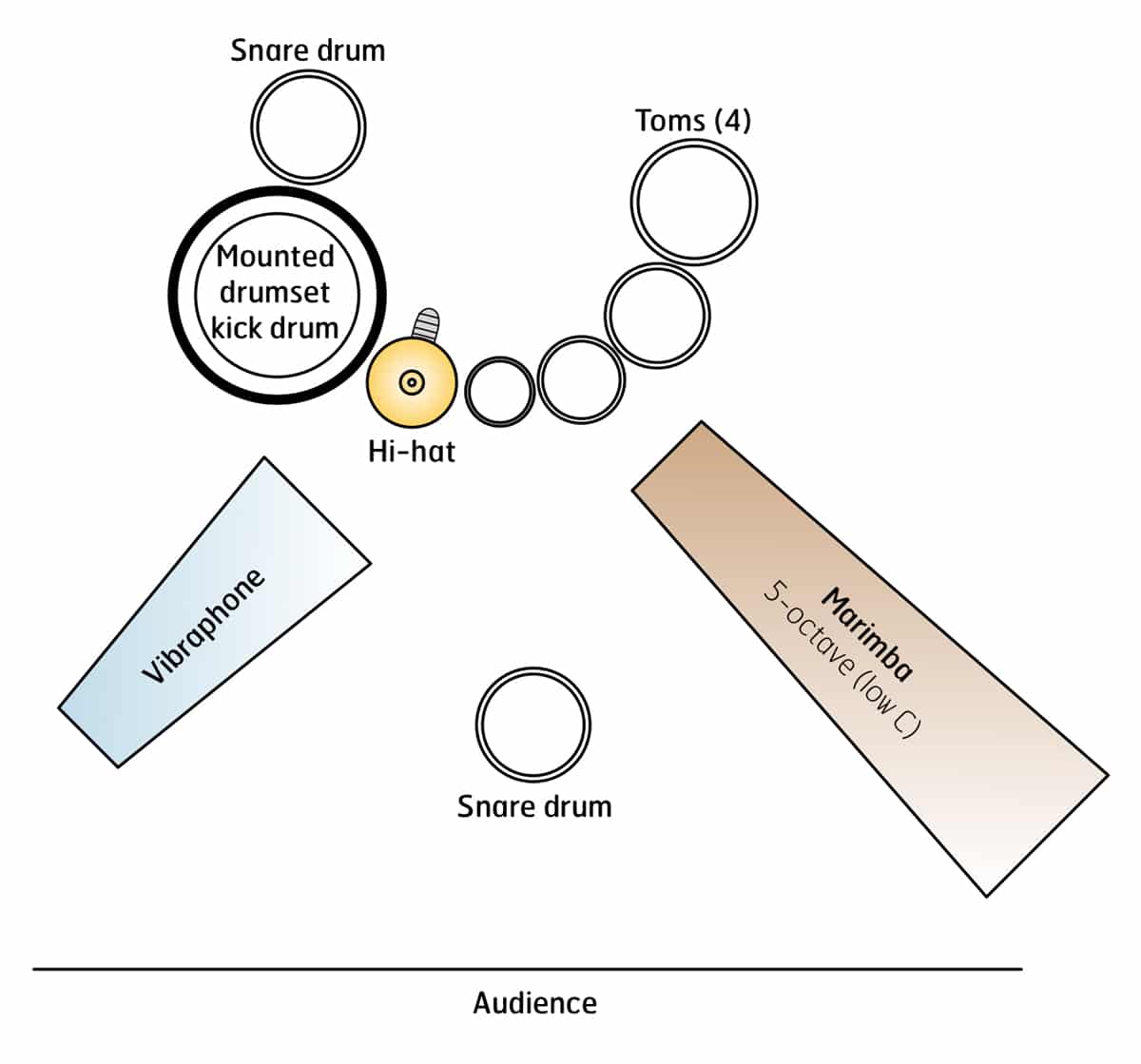 - Drums (snare drum, 4 concert toms, mounted drumset kick drum)