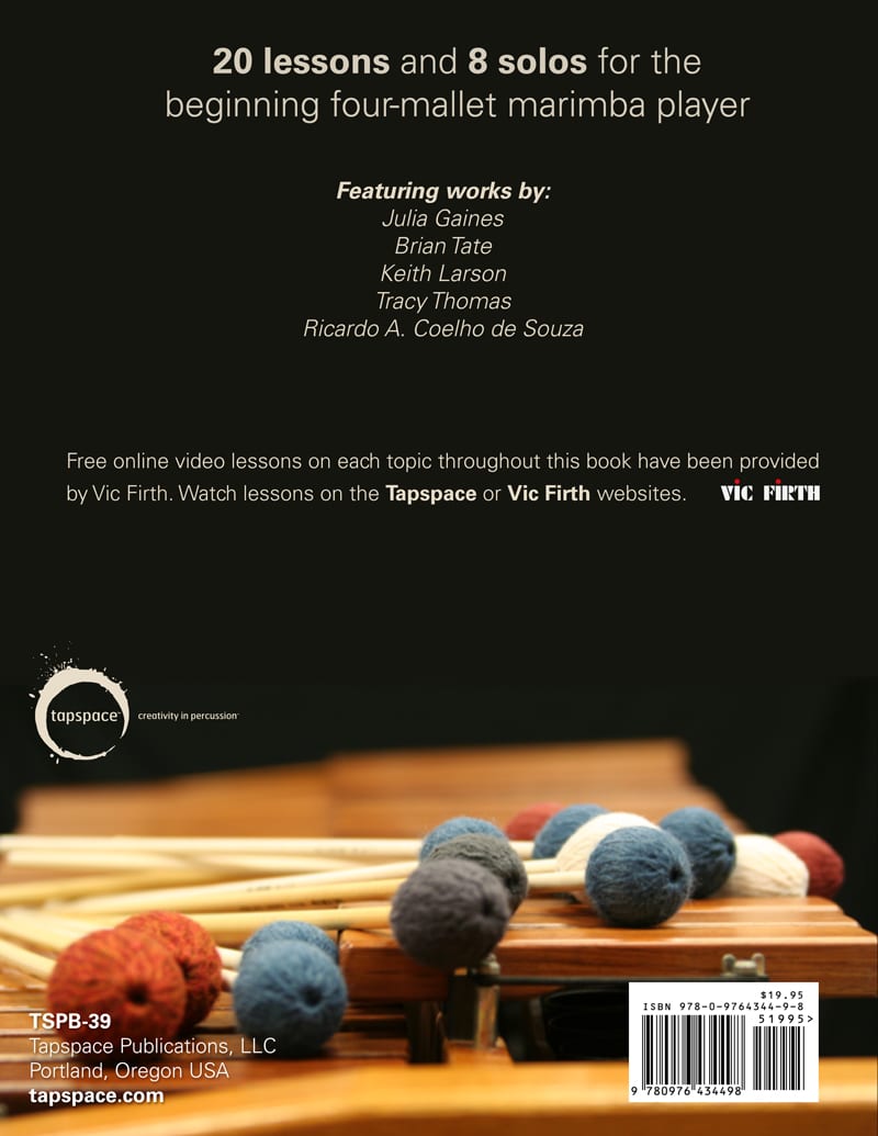 After some piano and snare drum instruction, Julia Gaines‘ Sequential Studies for Four-Mallet Marimba – Level 1 is the next step needed for learning four-mallet marimba. It includes twenty sequential lessons with four or five exercises each that focus on a different technical aspect of four-mallet technique. No matter what grip you play with, this text will work on your stroke, interval expansion, and stamina. Also included are eight beginning solos, three commissioned specifically for this book. All you need to do is pick your mallets and your grip and you’ll be playing your first four-mallet solo in no time!