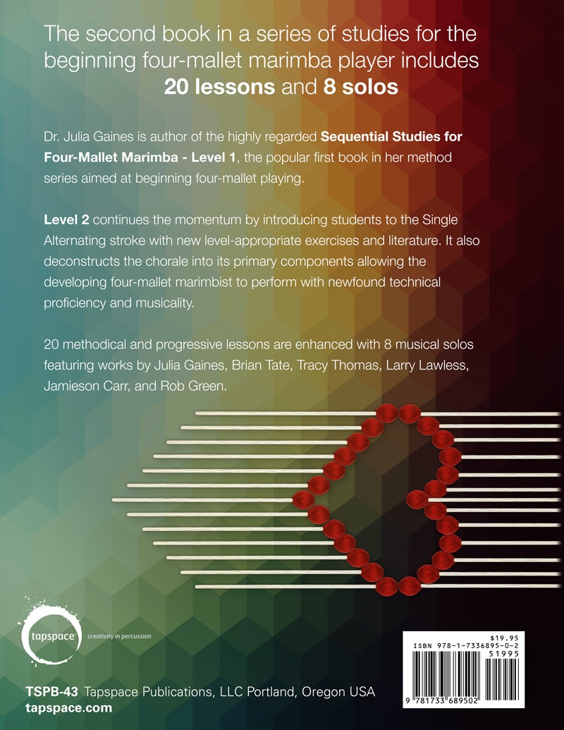 Julia Gaines’ Sequential Studies for Four-Mallet Marimba (Book 2) continues the pedagogical quest to produce well-rounded, musical marimbists. In this more streamlined and niche volume, Julia focuses on a specific performance style that is idiomatic to the marimba: the chorale. This book contains 20 individual lessons, with the goal of producing beautiful, lush, and above all, smooth rolls.