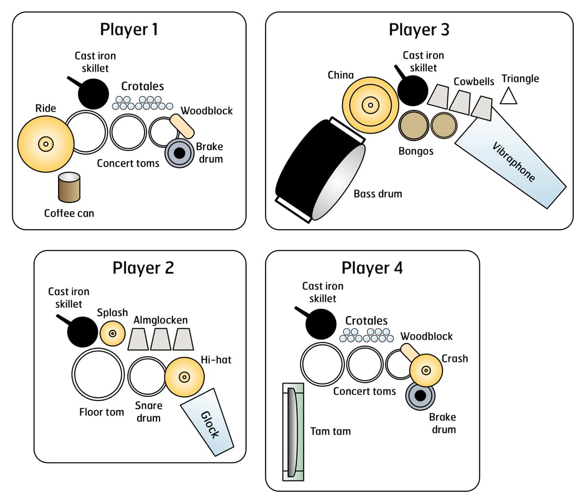 - Accessories (sandpaper blocks, coffee can, 4 iron skillets, 2 brake drums 2 brake drums, 3 almglocken, triangle, 3 cowbells, 2 woodblocks, maracas)
