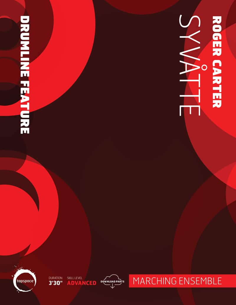 Written for and dedicated to the 2021 Bluecoats drumline, Roger Carter’s groove-filled piece Syvåtte (pronounced “Seev-OTT-uh”) is inspired by the tune Alfonso Muskedunder by the Norwegian DJ Todd Terje. The title Syvåtte is a combination of the two Norwegian words for seven (syv) and eight (åtte), which is in reference to the driving and incessant 7/8 time signature used for most of the piece. Throughout this work, Roger explores different feels within this 7/8 time signature to create new and intriguing rhythmic textures. There’s also a host of hybrid rudiments and irregular rhythms that will challenge the most skilled contemporary rudimental players.