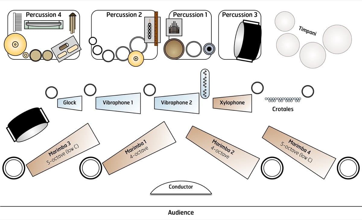- Drums — bongos, 2 concert bass drums, 5 concert toms (graduated, single player), djembe, 4 impact drums, snare drum, 5 toms (used individually by keyboard players)