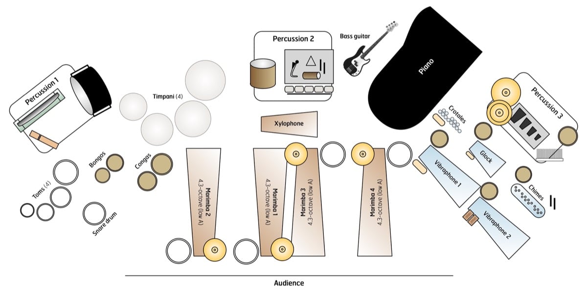 The piece is intensely rhythmic, with surging 16th note figures by the full ensemble serving as a recurring motif. In between these moments are phrases highlighting the different instrument types, often moving from sextet to sextet in an imitative fashion. The sonic development of the piece is built around the interplay of textures between these main sections of the ensemble. Later in the piece, players pick up accessories that mimic the sounds of opposing sextets – vibraphone players pick up woodblocks, for instance.