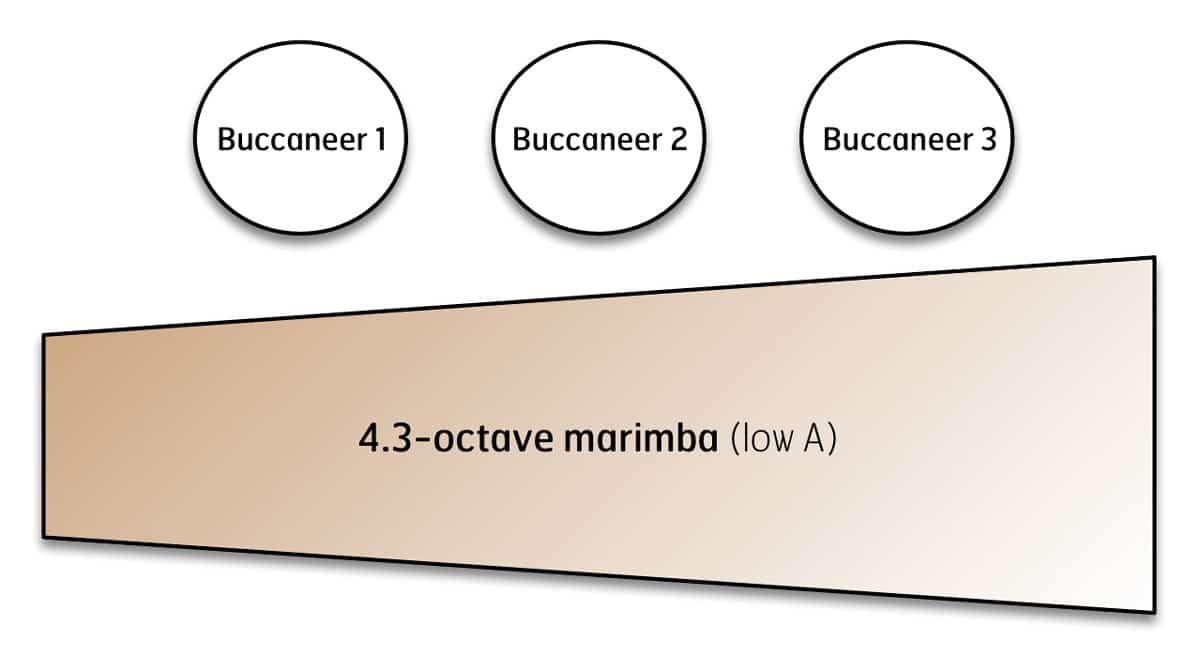 The marimba is one of the most popular instruments in the Caribbean Islands. The performance of Caribbean music often features multiple players on a single marimba. Such is the case in Brian Slawson‘s The Three Buccaneers. Three players share one standard, 4.3-octave (low A) marimba to create a playful musical ride!