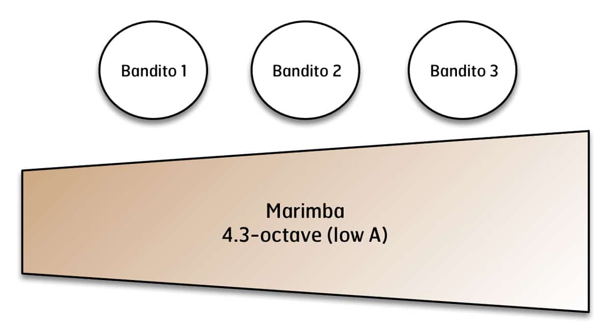 Designed to expose young players to the concept of odd meters and Mexican folk music, Brian Slawson‘s The Three Banditos places three players onto one marimba. The result is a fun and educational piece that is both light and rhythmic.